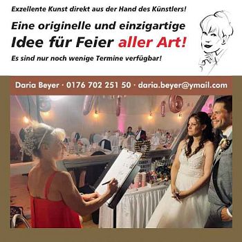 Karikatur und Schnellzeichnung für Ihre Veranstaltung! Besonders beliebt bei Firmenfeier, Hochzeiten, Geburtstagsfeiern, Jubiläen oder Weihnachtsfeiern! Faszinierende Schnellzeichnung und amüsante Karikaturen - in wenigen Minuten entsteht ein Porträt oder eine Karikatur!