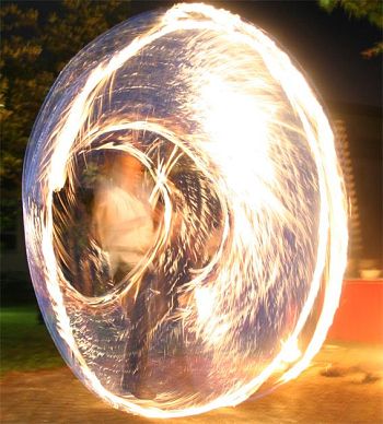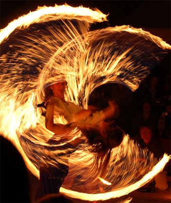 Mit Fackeljonglage, Feuerstab, Feuerschlucken, Fackelswinging, Feuerseilen und großen Stichflammen.