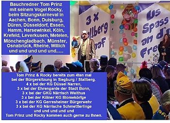 Tom Prinz - Gentleman der Bauchredner, Großmeister der Zauberkunst - bietet Ihnen humorvoll verblüffendes zur Familien- / Weihnachtsfeier, zum Karneval, für Dinner & Show, sowie für Rheinkreuzfahrten uvm. 2021 zum Künstler des Jahres gekürt.