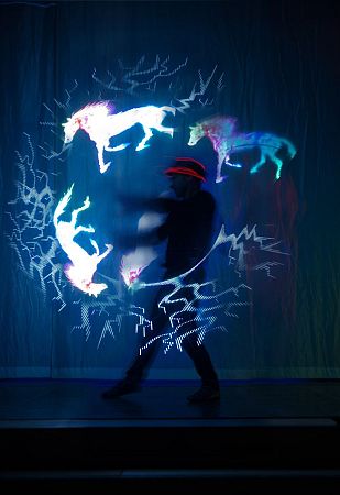 Der Showkünstler Volker Maria Maier präsentiert eine faszinierende Fusion aus Jonglage und Lichtkunst. Seine leuchtenden Stäbe und Bälle formen sich in immer neuen Mustern, hinterlassen strahlende Spuren und schaffen eine moderne Inszenierung aus Licht und Bewegung, die zu seinem